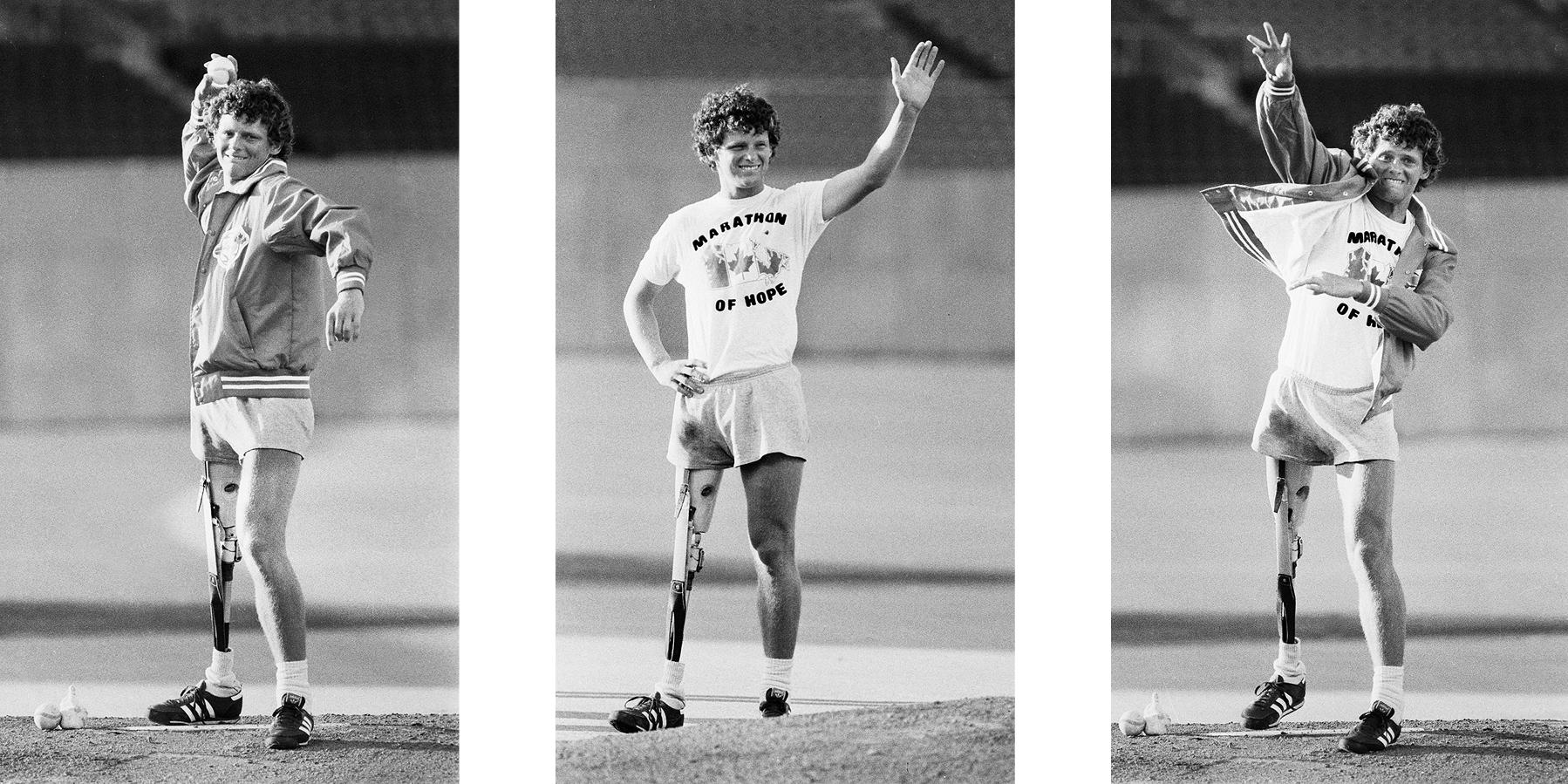 Terry Fox throws the first pitch at a Toronto Blue Jays game on July 11, 1980.